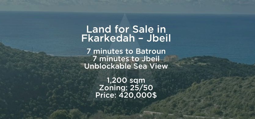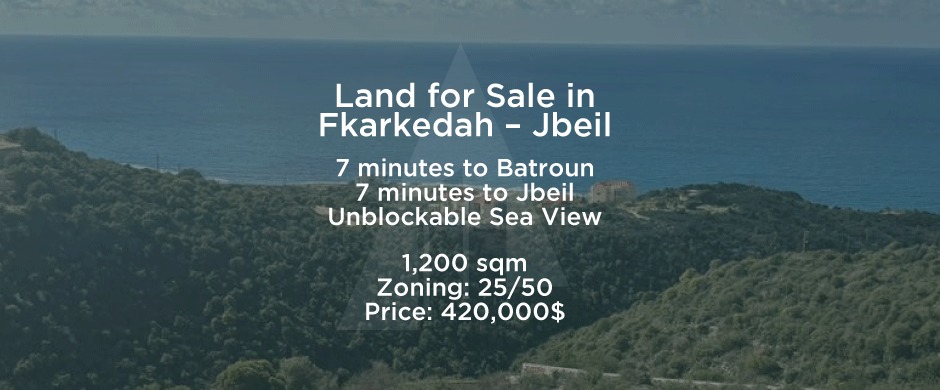 Exceptional 1,200 sqm land for sale in Fkarkedeh, ideally located just minutes from the highway and offering a stunning, unblockable sea view — perfect for building your dream villa.